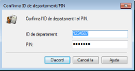Quan intenteu enviar un treball des d'un ordinador amb la gestió d'ID de departaments activada es mostra la pantalla emergent següent (tret que la casella [Confirma ID de departament/PIN en imprimir]/[Confirma ID de departament/PIN en enviar faxos] es desmarqui):