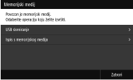 Ako je <Zaslon kod povez. mem. medija> postavljen na <Uključ.>, dostupne radnje prikazuju se kada se umetne USB memorijski uređaj dok je prikazan Početni zaslon. <Zaslon kod povez. mem. medija>