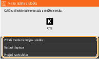 Ako se poruka prikaže kada uređaj prima faks ili je postavljen automatski ispis izvješća, primljeni faksovi/I-faksovi i izvješća pohranit će se u memoriji da pri ispisu ne bi bili blijedi. Da biste nastavili ispisivati čak i ako je razina tonera u spremniku niska, opciju <Nastavite s ispisom. T. nis.> postavite na <Uključ.>. <Nastavite s ispisom. T. nis.>