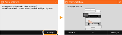 Hainbat kasutan, errore bat gertatzen denean, erroreari erantzuna emateko argibideak bistaratzen dira. Jarraitu pantailako argibideei errorea konpontzeko. Adibide gisa, ondoren papera trabatzen denean bistaratzen den pantaila agertzen da.
