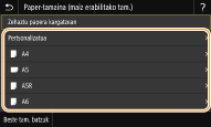 Paper-ezarpen lehenetsia erregistratu ondoren, papera kargatzean ez da paper-ezarpenen pantaila bistaratuko eta beti ezarpen bera erabiliko da. Paper-ezarpenak aldatu gabe beste paper-tamaina edo mota bat erabiltzen baduzu, baliteke makinak behar bezala ez inprimatzea. Arazo hau saihesteko, hautatu <Zehaztu papera kargatzean> 3. urratsean eta ondoren kargatu papera.