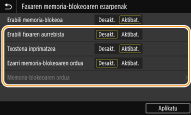 <Menua>  <Funtzio-ezarpenak>  <Jaso/Desbideratu>  <Ohiko ezarpenak>  <Ezarri faxaren/I-Fax aplikazioaren sarrerako ontzia>  <Faxaren memoria-blokeoaren ezarpenak>  Hautatu <Aktibat.> hemen: <Erabili memoria-blokeoa>  Zehaztu ezarpen bakoitza  <Aplikatu>