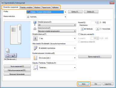 Hautatu makina honetarako inprimagailuaren kontrolatzailea eta sakatu [Preferences] edo [Properties].