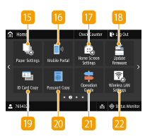 ![]() | <Paper Settings>This button is used for specifying the size and type of paper loaded in the paper drawer and multi-purpose tray. Specifying Paper Size and Type <Mobile Portal>Use this to establish a connection to a mobile device. Connecting with Mobile Devices <Home Screen Settings>Allows you to change the order that Home screen buttons are displayed in. Customizing the Home Screen <Update Firmware>Allows you to update the firmware via the Internet. Updating the Firmware <ID Card Copy>Use this function to copy the front and back sides of a driver's license or other card onto the same side of one sheet of paper. Making ID Card Copies <Passport Copy>Allows you to copy multiple passports onto one sheet. Making Passport Copies <Operation Guide>Press to view operation guidance and error causes/solutions. <Wireless LAN Settings>Use this button to configure the wireless LAN settings. Connecting to a Wireless LAN |