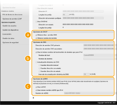 Seleccione la casilla de verificación para actualizar dinámicamente los registros DNS cuando cambie la dirección IP del equipo. Para especificar los tipos de direcciones que desea registrar en el servidor DNS, seleccione la casilla de verificación de [Guardar dirección manual], [Guardar dirección con estado] o [Guardar dirección sin estado]. Para especificar el intervalo entre las actualizaciones, introduzca el tiempo en horas en el cuadro de texto [Intervalo de actualización dinámica de DNS].