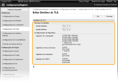 Usando o painel de operaçõesTambém é possível ativar ou desativar a comunicação codificada do TLS no <Menu> da tela Início. <Interface Remota> Iniciando a Interface de Usuário Remota com o TLSSe você tentar iniciar a Interface de Usuário Remota quando o TLS estiver ativado, um alerta de segurança sobre o certificado de segurança pode ser exibido. Neste caso, verifique se a URL correta foi digitada no campo de endereço e depois prossiga para exibir a tela da Interface Remota. Iniciando a Interface Remota Usando TLS para codificar a comunicação por e-mail/I-FaxSe os servidores SMTP e POP3 suportam o TLS, você pode ativar o TLS para a comunicação com estes servidores (Definindo as configurações de comunicação por e-mail/I-Fax). Para obter mais informações sobre os servidores SMTP e POP3, entre em contato com seu provedor de serviços de internet ou o Administrador de rede. |