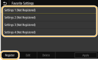 Registered settings are retained even when the machine is turned OFF. If you want to delete a registered setting, select <Copy>  <Other Settings>  <Favorite Settings>  select the settings, and select <Delete>  <Yes>. |