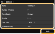 If you register your frequently used settings as "favorite settings," you can quickly call up the same settings every time you make copies, send a fax, or scan. In addition, if you register complicated settings as "favorite settings," you can quickly call them up for ease of operation. You can also assign registered setting combinations to a shortcut button displayed in the Home screen. This section describes how to register frequently used settings and how to call them up when making a copy.