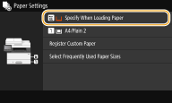 After the default paper setting is registered, the paper setting screen is not displayed when paper is loaded, and the same setting is always used. If you load a different paper size or type without changing the paper settings, the machine may not print properly. To avoid this problem, select <Specify When Loading Paper> in step 3, and then load the paper. |