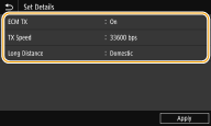 You can also specify <ECM TX> and <TX Speed> from <Menu> <Function Settings> <Send> <Fax Settings>. However, settings made from <Address Book> are enabled for the detailed settings of destinations registered in the Address Book. |