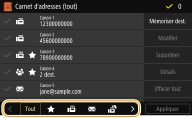 ![]() | Vous pouvez enregistrer dans le carnet d'adresses les destinataires de télécopie ou de numérisation fréquemment utilisés afin de les sélectionner facilement en cas de besoin (Enregistrement de destinataires dans le carnet d'adresses). Vous pouvez rechercher les destinataires par ordre alphabétique dans les listes du carnet d'adresses ou en saisissant un code à trois chiffres (numéro de composition codée). Vous pouvez également spécifier des destinataires plus rapidement en utilisant les fonctions suivantes. |