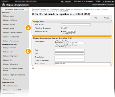 Comme les certificats générés sur l'appareil ne portent pas de signature CA, une erreur de communication peut se produire avec certains périphériques avec lesquels l'appareil communique. Pour qu'une autorité de certification émette le certificat avec une signature CA, vous devez obtenir les données de demande de signature de certificat (CSR), que l'administrateur peut générer depuis l'interface utilisateur distante. Une fois le certificat émis, enregistrez-le sur la clé générée avec la demande CSR.