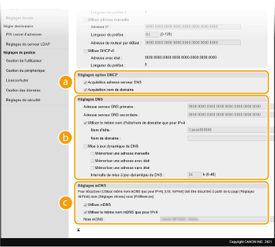 2 | Configurez les réglages DNS IPv4. ![]() [Réglages option DHCP][Acquisition nom d'hôte] Cochez la case pour activer Option 12 afin d'obtenir le nom d'hôte à partir du serveur DHCP. [Mise à jour dynamique du DNS] Cochez la case pour activer Option 81 afin de mettre à jour de façon dynamique les enregistrements DNS par le biais du serveur DHCP. [Acquisition adresse serveur DNS] Cochez la case pour activer Option 6 afin d'obtenir une adresse de serveur DNS auprès du serveur DHCP. [Acquisition nom de domaine] Cochez la case pour activer Option 15 afin d'obtenir un nom de domaine auprès du serveur DHCP. [Acquisition adresse serveur WINS] Cochez la case pour activer Option 44 afin d'obtenir une adresse de serveur WINS auprès du serveur DHCP. [Acquisition adresse serveur SMTP] Cochez la case pour activer Option 69 afin d'obtenir une adresse de serveur SMTP auprès du serveur DHCP. [Acquisition adresse serveur POP] Cochez la case pour activer Option 70 afin d'obtenir une adresse de serveur POP3 auprès du serveur DHCP. [Réglages DNS][Adresse serveur DNS primaire] Spécifiez l'adresse IP d'un serveur DNS. [Adresse serveur DNS secondaire] Spécifiez l'adresse IP d'un serveur DNS secondaire, le cas échéant. [Nom d'hôte] Saisissez le nom d'hôte de l'appareil (en caractères alphanumériques) qui est enregistré sur le serveur DNS. [Nom de domaine] Saisissez le nom de domaine (en caractères alphanumériques) auquel l'appareil appartient, tel que "exemple.com." [Mise à jour dynamique du DNS] Cochez la case pour mettre à jour de façon dynamique les enregistrements DNS dès qu'une adresse IP de l'appareil change. Pour indiquer le laps de temps entre deux mises à jour, saisissez-le dans la zone de texte [Intervalle de mise à jour dynamique du DNS]. [Réglages mDNS][Utiliser mDNS] Adopté par Bonjour, le protocole mDNS (multicast DNS) est un protocole associant le nom d'hôte à une adresse IP sans faire intervenir le DNS. Cochez la case pour activer mDNS et saisissez le nom mDNS dans la zone de texte [Nom mDNS]. |
