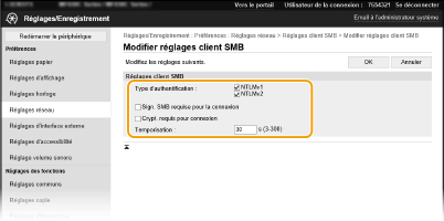 Faites les réglages à utiliser lorsque l'appareil se connecte à un réseau en tant que client SMB.