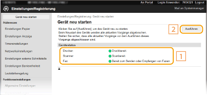 Überprüfen Sie den [Gerätestatus] um sicherzustellen, dass keine Funktionen ausgeführt werden, und klicken Sie auf [Ausführen].