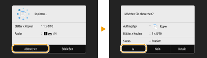 Wenn Sie das Kopieren unmittelbar nach der Auswahl der Taste <Start> abbrechen möchten, wählen Sie auf dem Bildschirm die Option <Abbrechen>, oder drücken Sie auf dem Bedienfeld die Taste