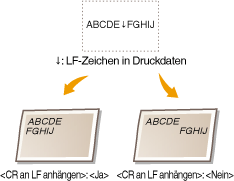 Legen Sie fest, ob ein CR-Zeichen (Carriage Return, Wagenrücklauf) angehängt werden soll, wenn das Gerät ein LF-Zeichen (Line Feed, Zeilenvorschub) empfängt. Wenn Sie <Ja> wählen, wird die Druckposition bei einem LF-Zeichen an den Anfang der nächsten Zeile verschoben. Wenn Sie <Nein> wählen, wird die Druckposition zur nächsten Zeile verschoben, direkt unter dem LF-Zeichen.