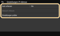 Manuelles Eingeben einer IP-Adresse1 | Wählen Sie <Auto erfassen>, und wählen Sie dann <Aus> unter <Auto erfassen> <Anwenden> <OK>. |