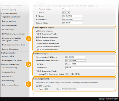 Das von Bonjour implementierte mDNS (Multicast-DNS) ist ein Protokoll zur Zuordnung von Hostnamen zu IP-Adressen ohne DNS. Aktivieren Sie das Kontrollkästchen, um mDNS zu aktivieren, und geben Sie den mDNS-Namen in das Textfeld [Name mDNS] ein.