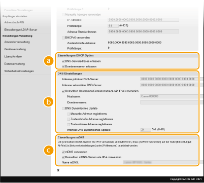 Aktivieren Sie das Kontrollkästchen, wenn die DNS-Datensätze dynamisch aktualisiert werden sollen, sobald sich die IP-Adresse des Geräts ändert. Aktivieren Sie das Kontrollkästchen [Manuelle Adresse registrieren], [Zustandshafte Adresse registrieren] oder [Zustandslose Adresse registrieren], je nachdem, welche Art oder Arten von Adressen beim DNS-Server registriert werden sollen. Wenn die Aktualisierungen in einem festen Intervall erfolgen sollen, geben Sie dieses in Stunden in das Textfeld [Intervall DNS Dynamisches Update] ein.