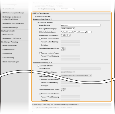 Mit SNMPv3 können Sie eine durch robuste Sicherheitsfunktionen geschützte Netzwerkgeräteverwaltung implementieren. Beachten Sie, dass Sie TLS für Remote UI aktivieren müssen, bevor Sie SNMPv3 konfigurieren (Konfigurieren des Schlüssels und des Zertifikats für TLS).