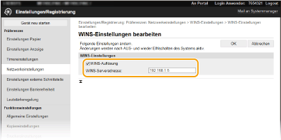 Auswählen von Einstellungen über das BedienfeldSie können auf die WINS-Einstellungen auch über <Menü> auf dem Bildschirm Startseite zugreifen. <WINS-Einstellungen> |