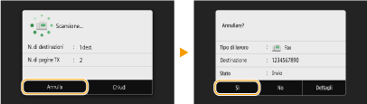 Se si desidera annullare l'invio dei fax subito dopo aver selezionato <Avvio>, selezionare <Annulla> sul display o premere  sul pannello operativo. È inoltre possibile annullare l'invio dei fax dopo aver controllato lo stato del fax.