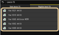 Per controllare i registri di comunicazione dei documenti inviati e ricevuti1 | Selezionare il documento di cui si desidera verificare il registro nella scheda <Registro lavori TX> o <Registro lavori RX>. <OK> viene visualizzato quando un documento è stato inviato o ricevuto correttamente, e <Errore> viene visualizzato quando un documento non viene inviato o ricevuto perché è stato cancellato o si è verificato un errore. ![]() Vengono visualizzate informazioni dettagliate relative al documento. ![]() Quando viene visualizzato un numero a tre cifre in caso di <Errore> Questo numero rappresenta un codice di errore. Per ulteriori informazioni, consultare "Risoluzione dei problemi (FAQ)" sul sito web dei manuali online. Registrazione della destinazione del documento inviato nella Rubrica Per un documento inviato in una destinazione non registrata nella Rubrica, è possibile registrare tale destinazione in Rubrica selezionando <Regis. in rubrica> nella schermata dei dettagli. |