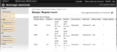 Vengono visualizzati i registri dei lavori di stampa, copia, invio (TX) e ricezione (RX).
