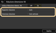 Specificare le impostazioni per ridurre la dimensione immagine di un documento ricevuto. È possibile selezionare un rapporto di riduzione automatico che riduca la dimensione del documento ricevuto in base al formato della carta caricata. È inoltre possibile selezionare un rapporto dall'elenco.