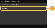 Selezionare <Centralino> quando si desidera connettere la macchina tramite un PBX (Private Branch Exchange). Impostare la funzione del tasto <R> visualizzato nella schermata delle funzionalità di base per il fax su <Prefisso> o <Aggancio>. Se si seleziona<Prefisso>, registrare il codice del prefisso nella schermata successiva. Immettere il codice del prefisso usando i tasti numerici, selezionare <Pausa>, quindi selezionare <Applica> Se non si inserisce una pausa, il codice del prefisso non viene registrato.