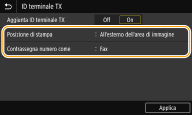 <Aggiunta ID terminale TX> <Off> <On>  <Posizione di stampa> <All'interno dell'area di immagine> <All'esterno dell'area di immagine>  <Contrassegna numero come> <Fax>  <Tel> |