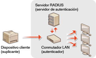 El equipo puede conectarse a una red 802.1X como dispositivo cliente. Una red 802.1X normal está formada por un servidor RADIUS (servidor de autenticación), un conmutador LAN (autenticador) y dispositivos cliente con software de autenticación (suplicantes). Si un dispositivo intenta conectarse a la red 802.1X, el dispositivo deberá autenticar al usuario para demostrar que la conexión pertenece a un usuario autorizado. La información de autenticación se envía y se comprueba a través de un servidor RADIUS, que permite o rechaza la comunicación con la red en función del resultado de la autenticación. Si en la autenticación no se obtienen los resultados esperados, un conmutador LAN (o un punto de acceso) bloquea el acceso desde el exterior de la red.