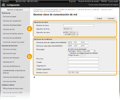 Es posible generar una clave y un certificado con el equipo si fuera necesario para la comunicación cifrada a través de Transport Layer Security (TLS). Puede utilizar TLS para acceder al equipo a través de la IU remota. Los certificados autofirmados se utilizan con la clave y el certificado generado en "Comunicación de red".