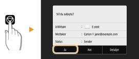 Hvis du vil avbryte sending av dokumenter umiddelbart etter du trykker på <Start>, trykker du på <Avbryt> på displayet eller på . Du kan også avbryte sending av dokumenter etter du har kontrollert sendestatusen.