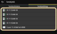 Sjekke loggen for sendte dokumenter1 | Velg dokumentet som du vil kontrollere loggen for i <Sendejobblogg>-kategorien. <OK> vises når et dokument ble sendt uten problemer, og <Feil> vises når et dokument ikke kunne sendes fordi det ble kansellert eller det oppstod en feil. ![]() Viser detaljert informasjon om dokumentet. ![]() Når et tresifret tall vises i stedet for <Feil> Dette nummeret representerer en feilkode. For mer informasjon, se "Feilsøking (FAQ)" på den elektroniske håndbokens nettside. Registrere destinasjonen til det sendte dokumentet til adresseboken For et dokument sendt til en destinasjon som ikke er registrert i adresseboken, kan du registrere den destinasjonen til adresseboken ved å velge <Registr. i adr.bok> på detaljskjermen. |