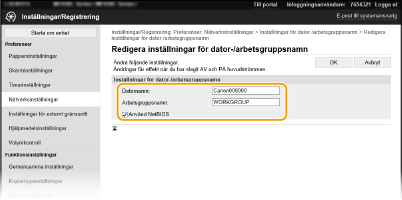Arbetsgruppsnamn är ett namn för att gruppera flera datorer så att grundläggande nätverksfunktioner, till exempel fildelning, blir tillgängliga i ett Windows-nätverk. Använd alfanumeriska tecken och ange namnet på den arbetsgrupp som enheten tillhör.