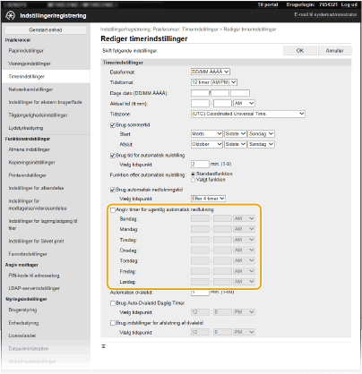 Marker afkrydsningsfeltet [Angiv timer for ugentlig automatisk nedlukning], og indstil tidspunktet, hvor der skal slukkes for strømmen.
