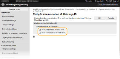 Indstilling af administration af afdelings-id'er til job fra computeren). Hvis afkrydsningsfeltet er valgt for denne indstilling, udføres jobbene dog, også selv om der ikke er indtastet id og pinkode. Hvis du ønsker at konfigurere en indstilling, så der ikke udføres noget job, med mindre korrekt afdelings-id og pinkode bliver indtastet, skal du fjerne markeringen i afkrydsningsfeltet.