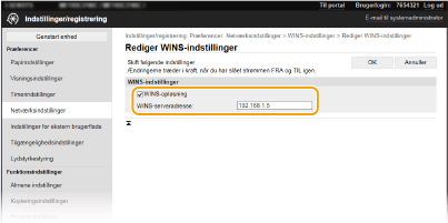 Hvis du vil angive WINS-serverindstillinger, skal [Indstillinger for Computernavn/Arbejdsgruppenavn] være angivet. Konfigurering af computernavn og arbejdsgruppenavn Hvis du fjerner markeringen i afkrydsningsfeltet [Brug NetBIOS] i [Indstillinger for Computernavn/Arbejdsgruppenavn], vil WINS-indstillingen blive deaktiveret. Sørg for at vælge afkrydsningsfeltet [Brug NetBIOS], når du bruger WINS. Funktionen er ikke tilgængelig i et IPv6-netværk. |