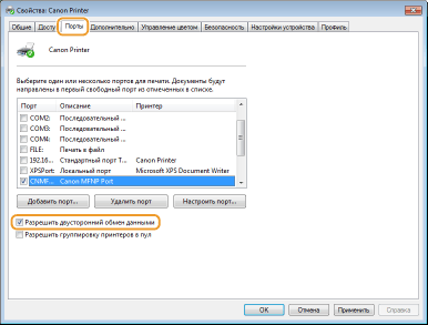 На вкладке [Порты] убедитесь, что установлен флажок [Разрешить двусторонний обмен данными].