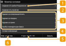 При нажатии клавиши <Монитор сост.> отображается экран, позволяющий просматривать ход обработки документов, а также состояние аппарата и сведения о параметрах сети.
