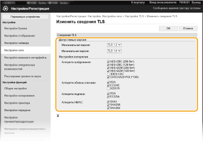 Можно включить шифрование для обмена данными между аппаратом и веб-браузером, используя протокол TLS (Transport Layer Security, безопасность транспортного уровня). Протокол TLS — это механизм шифрования данных, передающихся и получаемых по сети. При использовании Удаленного ИП для настройки параметров IPSec (Способ защищенного общего ключа), проверки подлинности IEEE 802.1X (TTLS/PEAP) или SNMPv3 необходимо включить протокол TLS. Чтобы использовать шифрованную связь TLS для Удаленного ИП, перед включением TLS необходимо задать "ключ и сертификат" (сертификат сервера), которые требуется использовать. Перед использованием TLS создайте или установите ключ и сертификат TLS (