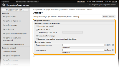 Если установлен флажок [Адресная книга (ABK)], невозможно экспортировать настройки аппарата одновременно с данными адресной книги.