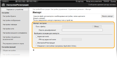 Не выключайте аппарат до завершения импорта или экспорта.Для завершения процесса может потребоваться несколько минут. Выключение аппарата во время процесса импорта/экспорта может привести к повреждению данных или аппарата. Не используйте аппарат во время импорта или экспортаПеред импортом или экспортом убедитесь, что в настоящий момент не выполняется какая-либо операция, например печать документов. |