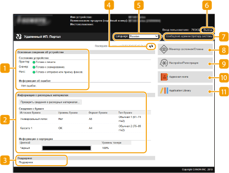 Отображение текущего состояния и информации об ошибках аппарата. Если возникает ошибка, отображается ссылка на страницу сведений об ошибке.