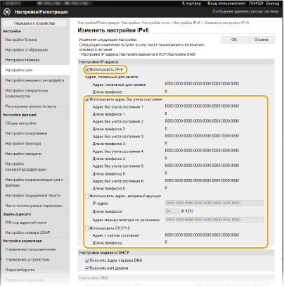 Адрес без учета состояния | Роутер анонсирует адрес, который создается автоматически с помощью MAC-адреса аппарата и префикса сети. Адреса без учета состояния удаляются при перезагрузке аппарата (или его включении). |