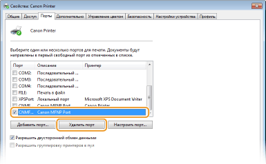 1 | Выберите порт, который требуется удалить, и нажмите кнопку [Удалить порт]. ![]() ![]() Невозможно удалить порт, который в данный момент настроен как порт принтера. Чтобы удалить этот порт, выберите другой порт и нажмите кнопку [Применить], чтобы настроить его как новый порт принтера, затем удалите исходный порт. |