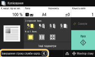 Це повідомлення інформує про те, що скоро буде необхідно замінити картридж із тонером. Переконайтеся, що запасний картридж із тонером напоготові. Якщо це повідомлення відображається перед початком друку великого завдання, замініть картридж із тонером. Цей елемент відображається, якщо для параметра <Дія під час попередження> встановлено значення <Зупинити друк> (