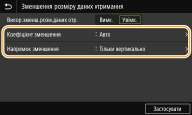 Укажіть параметри зменшення розміру зображення отриманого документа. Можна вибрати автоматичний коефіцієнт зменшення, який зменшує отриманий документ до розміру завантаженого паперу. Коефіцієнт також можна вибрати зі списку.